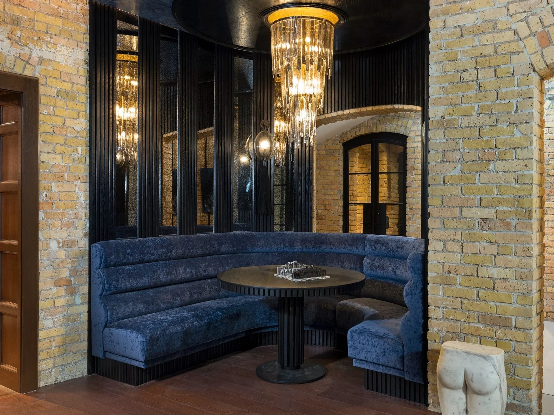 The Lounge in the lower level of Pillsbury Castle is a perfect blend of tradition and personal style. The brick walls, curved hallway, and arched pass-throughs provide an authentic period backdrop to showcase the owners’ sharp design sensibility. The vision was medieval sophistication for the modern era, with an avant-garde touch. Lush, velvet-like polyester fabrics by Maxwell were chosen for the midnight blue banquette upholstery and deep black drapery. A custom asymmetrical round banquette by Randy’s Booth Co. anchors the room, paired with a custom table by Rovan, surrounded by tambour inlaid with antique glass.