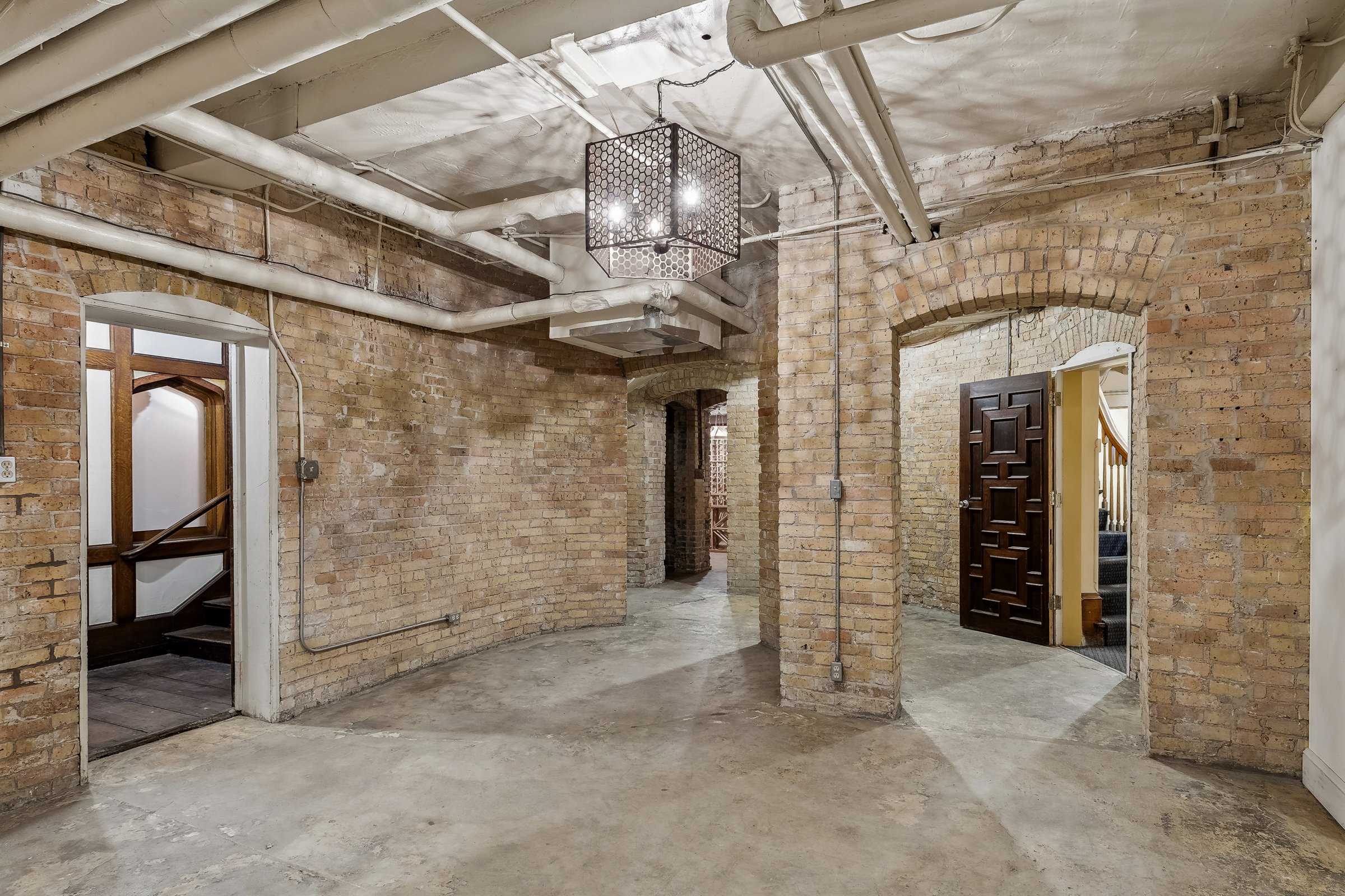 The Lounge now features a wallpapered ceiling with ebony oak medallion and LED lighting that creates the illusion that the ceiling is floating within the space. The 120-year-old concrete floor was removed to allow for new in-floor heat and floor lights, strategically located within the existing granite stone footings. The Home Theater is designed to be both functional and sophisticated, seamlessly connecting to the adjacent Lounge. It serves as a perfect spot for entertaining guests and cozy family movie nights. A custom millwork wall with a concave profile tambour, stained deep ebony, conceals the TV behind sliding doors.